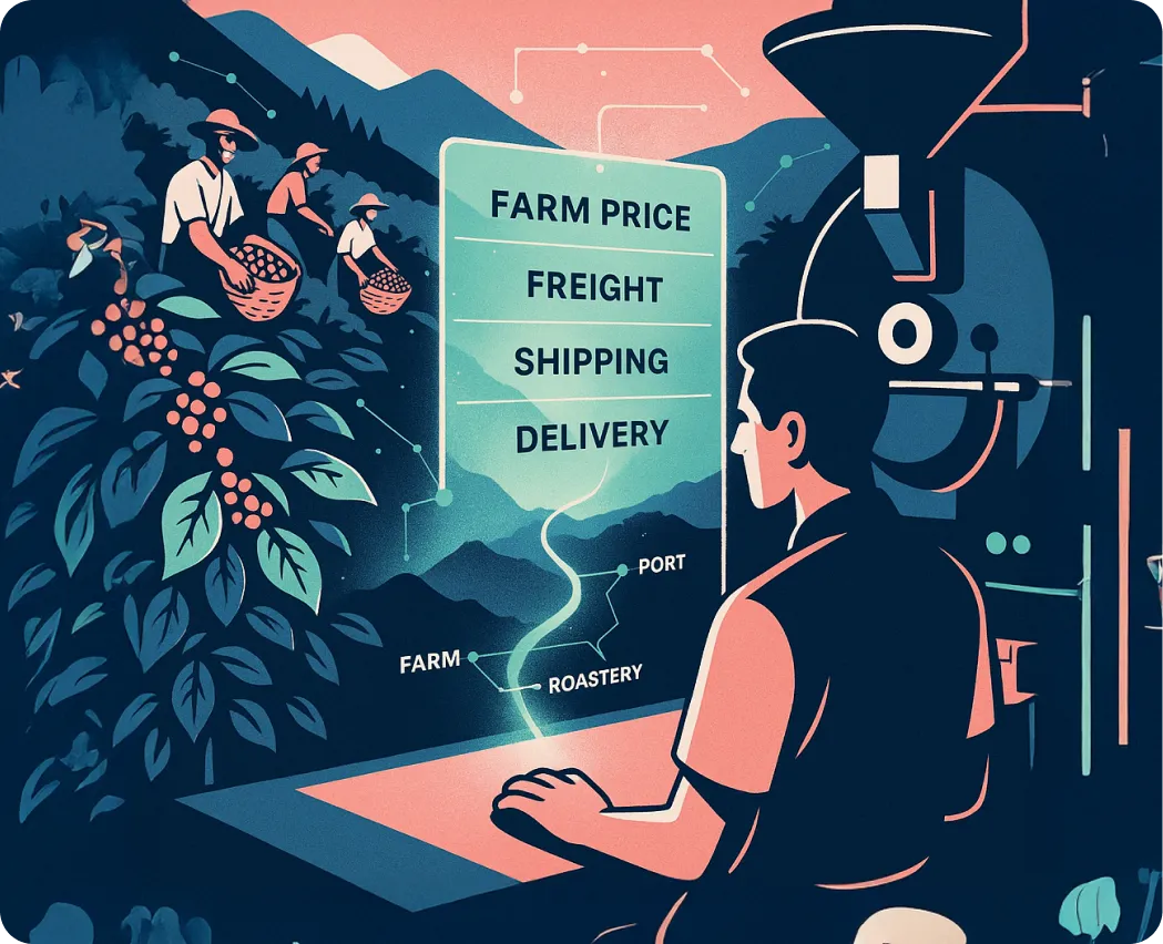 Powered by our proprietary AI, designed for farmers and roasters alike, we’ve revolutionized the coffee import process, making every cost, from farm to freight-instantly accessible.